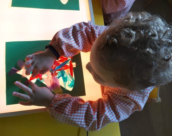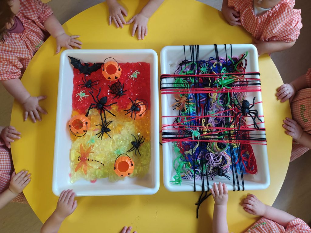 A lo largo del curso realizamos provocaciones, instalaciones o sesiones de experimentación con materiales que atraen el interés de los pequeños: harina, tierra, pinturas, flores, hojas, arroz, sal … De este modo se inician en la observación y manipulación de los distintos materiales descubriendo las posibilidades de los mismos, el resultado de sus acciones, experimentando sensaciones y aprendiendo a distinguir cualidades de los distintos elementos: suave, áspero, frío, caliente, brillante, dulce, salado, seco, húmedo …